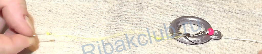 - Примерно на расстоянии 1 метра от грузила устанавливается свинцовая бусинка, которая будет препятствовать прохождению участка лески с поводками через ушко свинцового кольца.