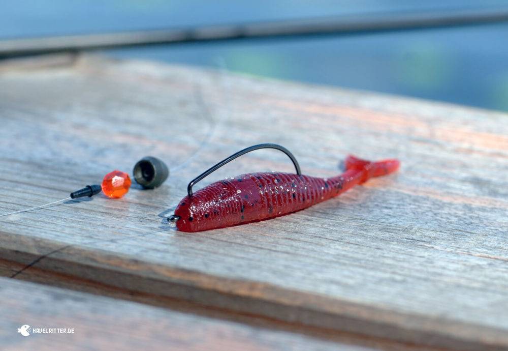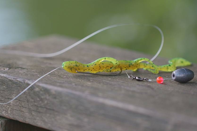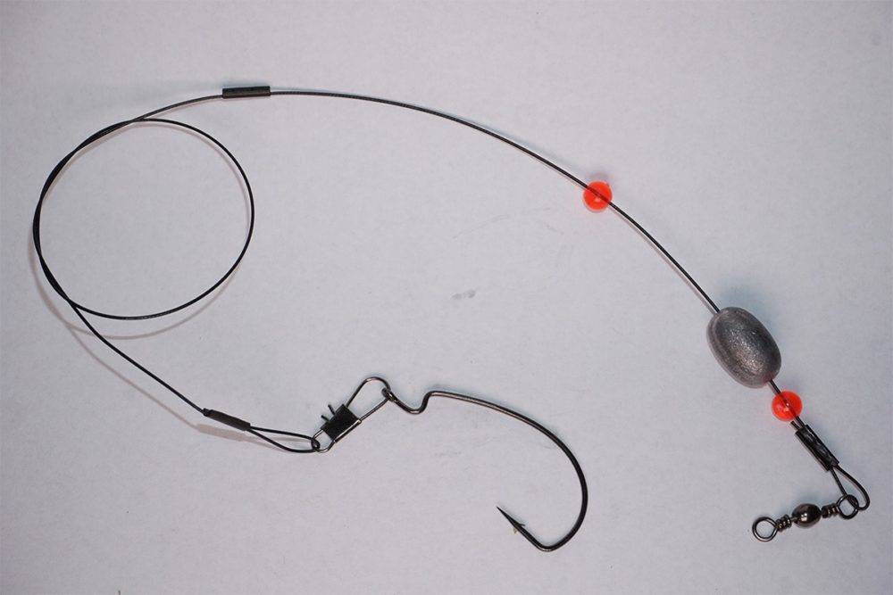 При ловле щуки с помощью данной оснастки добавляется обязательный элемент – металлический поводок, так как обычный флюорокарбон может не выдержать натиска хищника. Для нее не имеет значения невидимость поводка, длина его должна составлять около 10-15 см, что позволит не потерять приманку и добыть желанный трофей. При этом размер приманки не должен быть слишком маленьким, оптимальной для ловли щуки станет приманка с офсетным крючком 3/0-5/0.