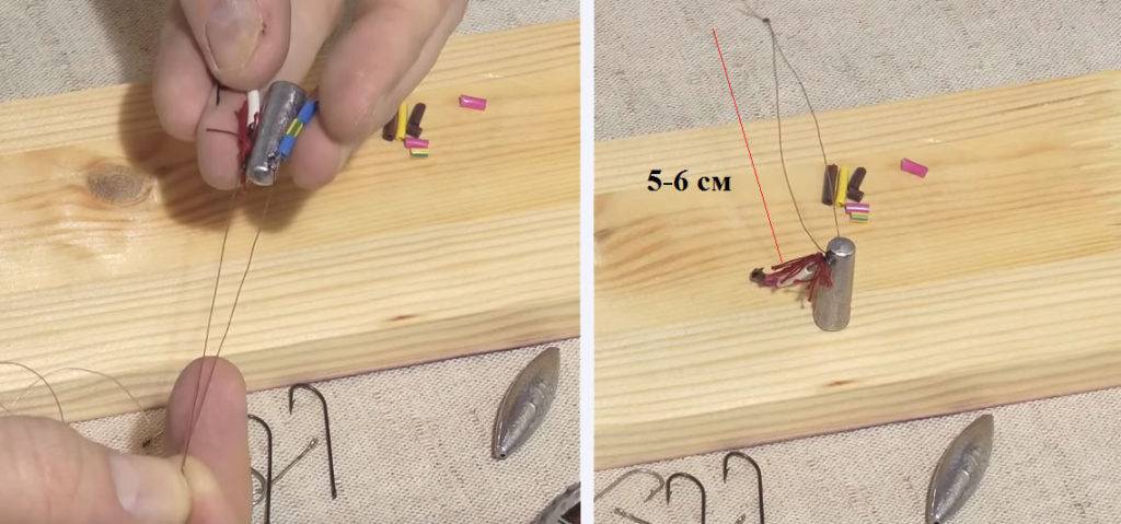 - Леску впаивают в верхней части грузила, на её петельки прикрепляют крючки, все это сооружение погружается в ил полностью.