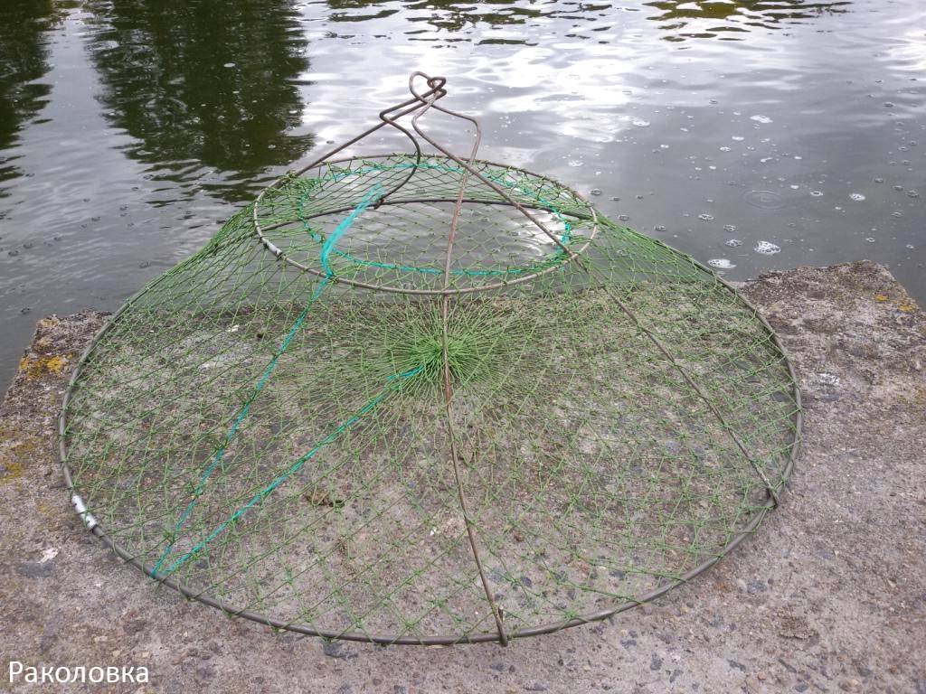 Раколовку еще называют речешней или ранней. Делается она из сетки проволоки или дерева. Наипростейшей является следующая конструкция: на круг диаметром 0,5-0,7 м натянута сетка с таким расчетом, чтобы она провисала посередине. Эта раколовка-хватка (раколовка-тарелка) прекрасно себя показывает на небыстрых течениях и глубинах до 1,6 м.