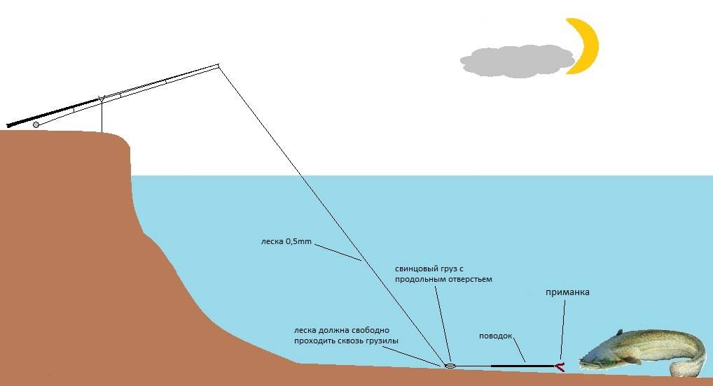 На донную снасть можно успешно ловить сома с берега, особенно ночью. Здесь главное угадать уловное место и правильно рассчитать дальность заброса приманки (они должны совпадать). Приманку к выбранному месту можно доставить на лодке, а затем вернуться к берегу и спокойно ожидать поклёвки.