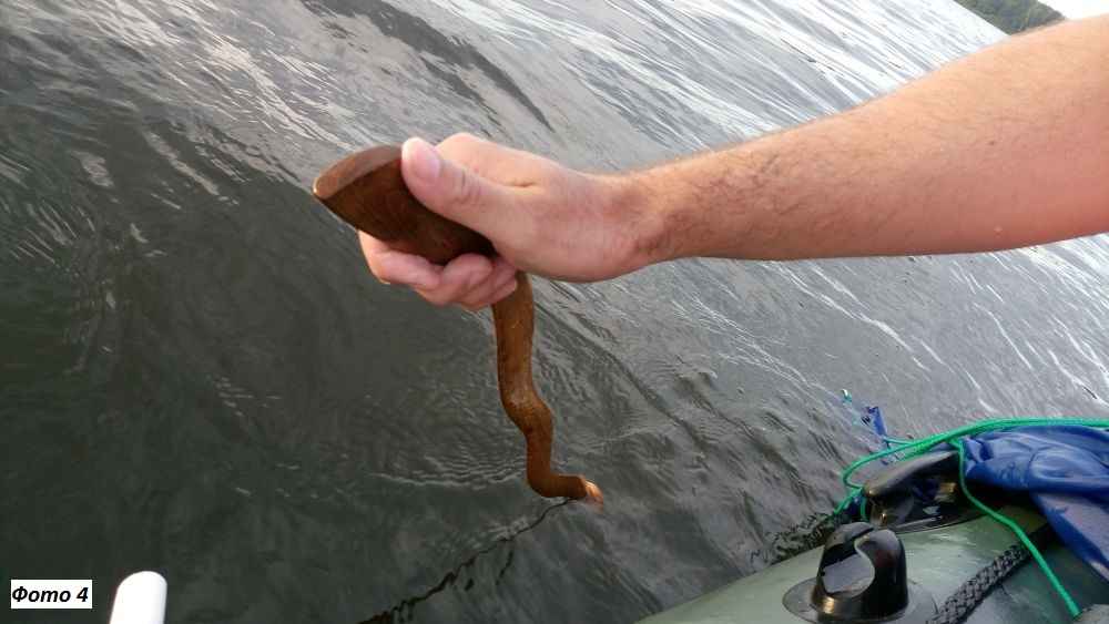 В процессе ловли наиболее востребованным оказался квок с «пятаком» диаметра 34 мм, выбивающий звуки низкой тональности, обычно необходимые для ловли сомов на большой глубине. Летом даже при сильной жаре сомы в своем большинстве находятся на глубинах 4 – 6 м, оставляя ямы пустыми (фото 3). И именно этот квок массово поднимал их с «лежанок», направляя к наживкам. Кроме того, он же доминировал при квочении на волнах в непогоду.