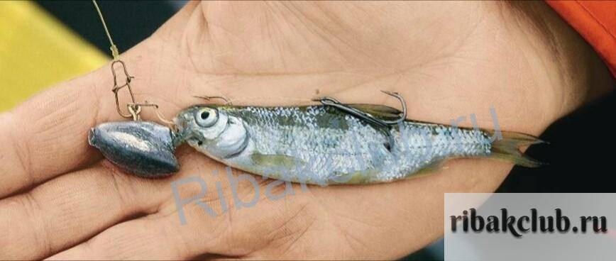 Насаживается мёртвая рыбка обычно на два тройника вниз головой. А кусочки рыбы необходимо насаживать на один двойной крючок. Все эти действия применяются как на донной удочке с кивком, так и на поплавочной оснастке.