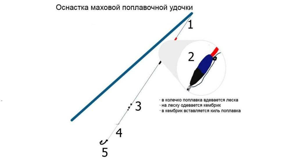Грузоподъёмность поплавка для маховой удочки выбирается исходя от длинны удилища. Удочку длинной до 5 метров оснащают поплавком грузоподъёмность не более 1,5 гр, на длину удилища в 5 — 6 метров ставится поплавок от 1 до 3 граммов, для 7 — 8 метровой удочки выбираем поплавки грузоподъёмностью 3 .. 5 гр, а на 9 — 10 метров от 4 до 8 гр.