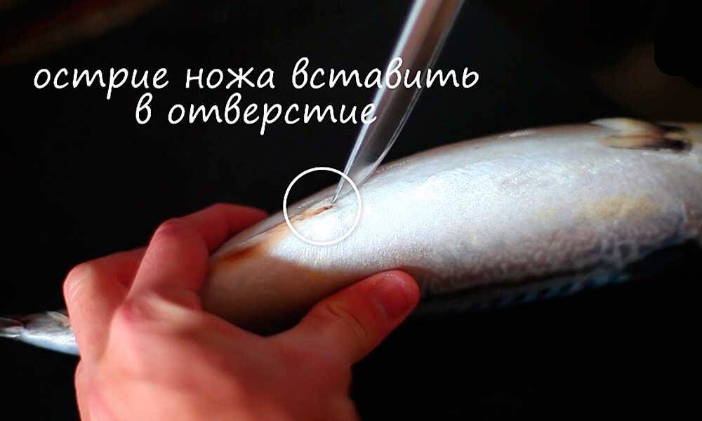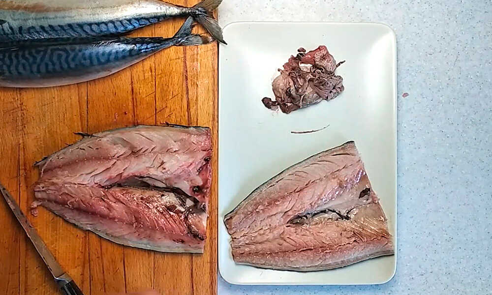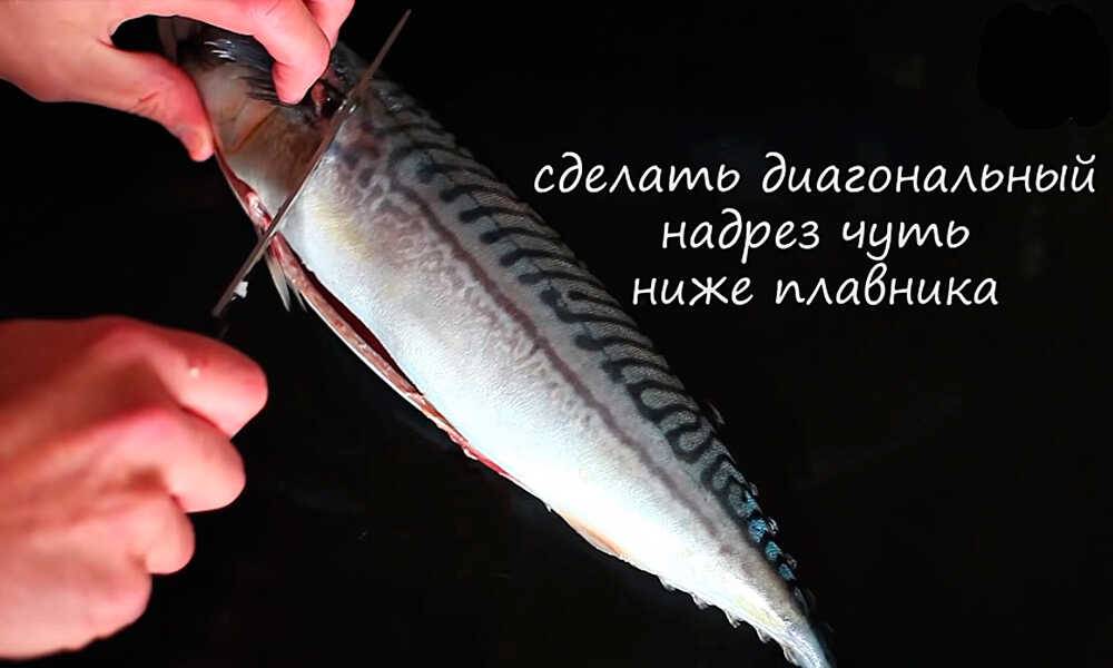 Традиционный способ разделки скумбрии – по брюшку. Достаточно отрезать голову за плавниками или удалить жабры, если хочется сохранить голову. Затем делают надрез по брюшку и вынимают внутренности, тщательно вычищая черные пленки.