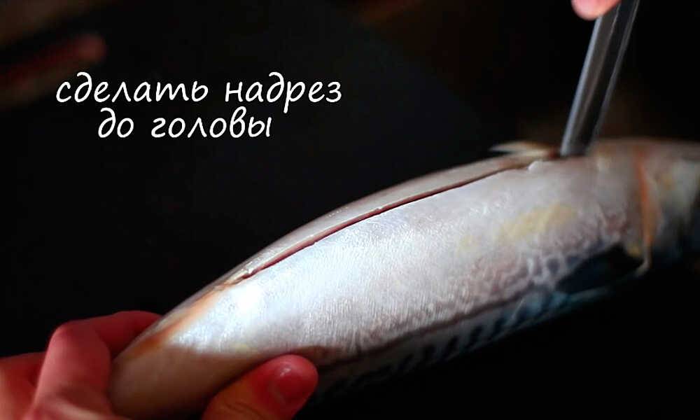 Затем вдоль спинки острым ножом по хребту делают разрез глубиной 3–4 мм. Он будет своеобразной разметкой.
