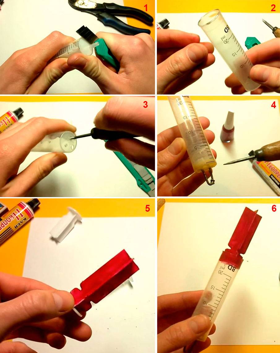 Для этого потребуются: одноразовый шприц 20 куб., спички, кусачки, толстая игла, зажигалка, вертлюг, пинцет, ножик, плоскогубцы, водостойкая краска, клей. Когда материалы и инструменты готовы, можно начинать изготовление.