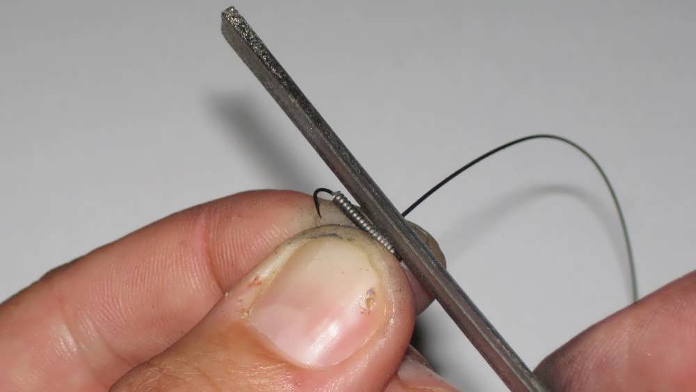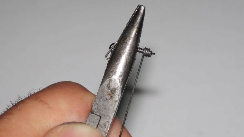 Спустя несколько секунд после прокаливания металл остывает. Ушко и верхняя часть загиба легко выравнивается плоскогубцами. Но прежде чем приступить к намотке, стоит запомнить, что попытка будет всего одна, ибо вольфрамовая проволока очень ломкая.