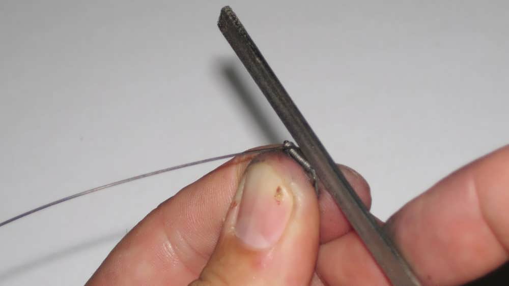 Для удобства кручения проволоки её кончик длиной 1,5 – 3 мм изначально желательно загнуть под прямым или чуть меньшим углом (фото 10). Затем зажать пассатижами (фото 11), а можно в тисках. Намотка производится большим и указательным пальцем.