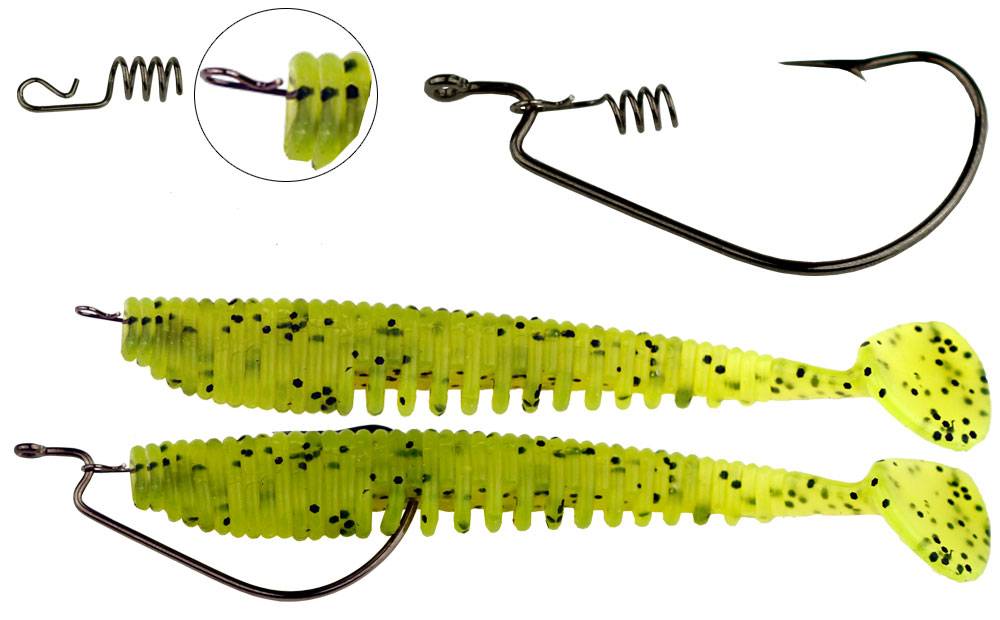 В таком монтаже пружина выполняет роль фиксатора и ввинчивается в силиконку. Такой вид крючка применяется для ловли активной рыбы, так как за счет пружинки приманка крепко держится на крючке и может выдержать большее число поклевок.
