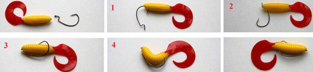 Затем уже внутри силиконки крючок нужно развернуть и сделать замер для определения места прокола. После прокалывания тела твистера нужно плотно прижать к нему острие и подтянуть насадку. Хвости при этом должен смотреть вниз (в сторону дна).
