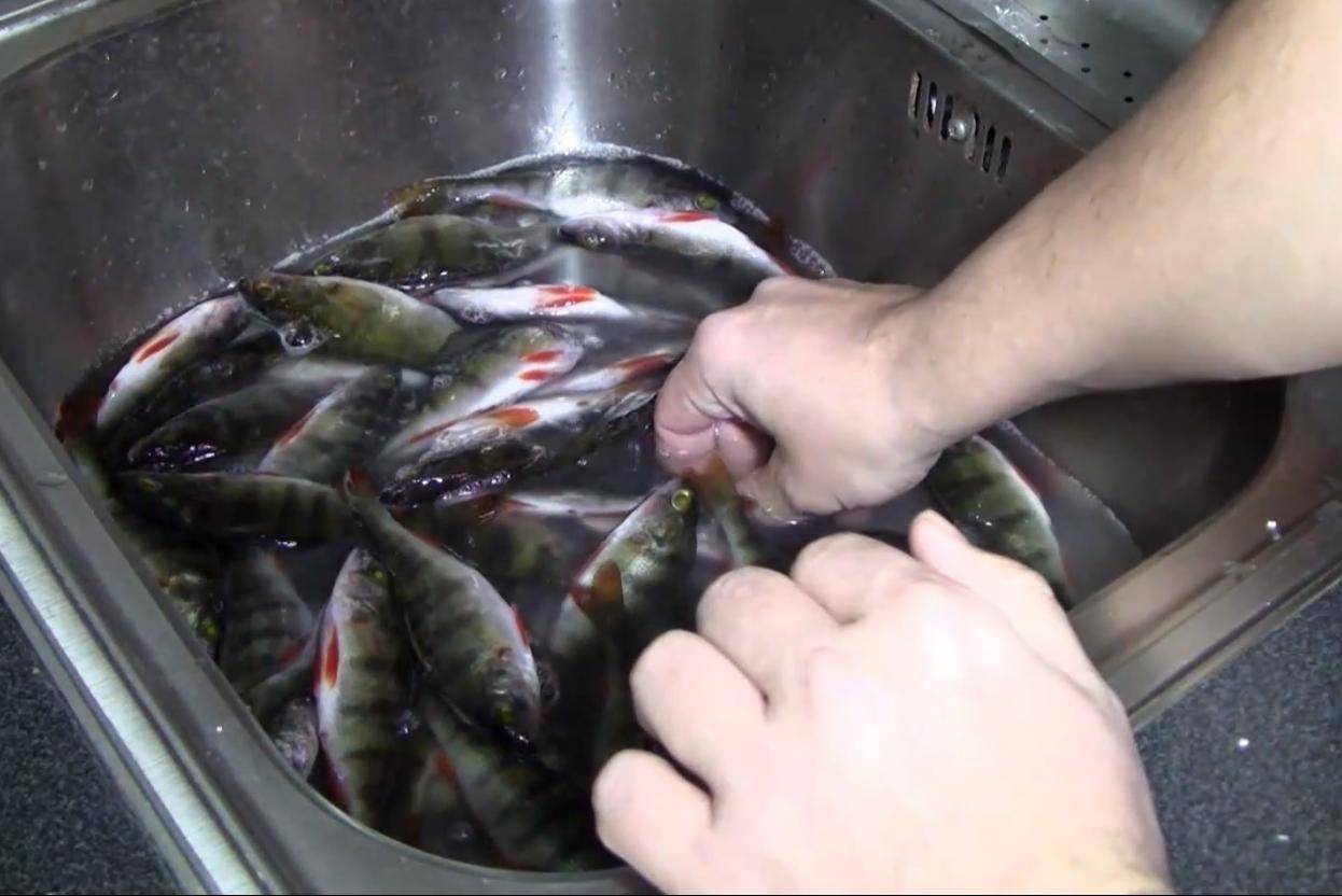 - Окуней промывают и кладут в подготовленный раствор так, чтобы он полностью их покрывал. Засекают 5 минут.