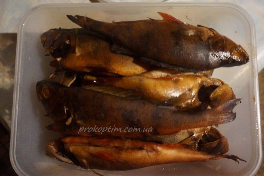 - В первые 6–8 часов поддерживают низкую температуру, чтобы окунь как следует прокоптился внутри.