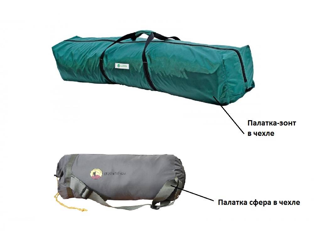 Если говорить о размерах в собранном виде, то палатка-зонт, проигрывает палаткам привычных видов. Особенно громоздки палатки для 3-4 человек, длина которых в чехле может достигать полутора метров. Примерное соотношение размеров палатки зонт и стандартной палатки типа сфера в собранном виде приведены на фото ниже.