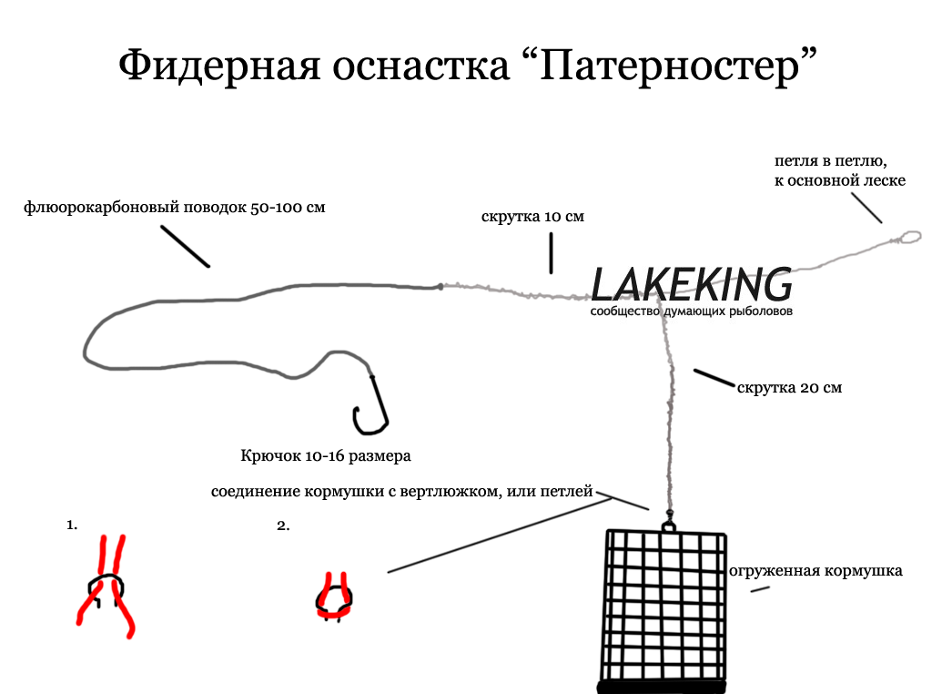 - Патерностер гарднера для фидера отличается от классического только тем, что в отвод на кормушку делается на петле. В классическом же виде это плечо делается из более слабой и тонкой лески – специально для того, чтобы при зацепе оторвалась кормушка, а не поводок с рыбой.
