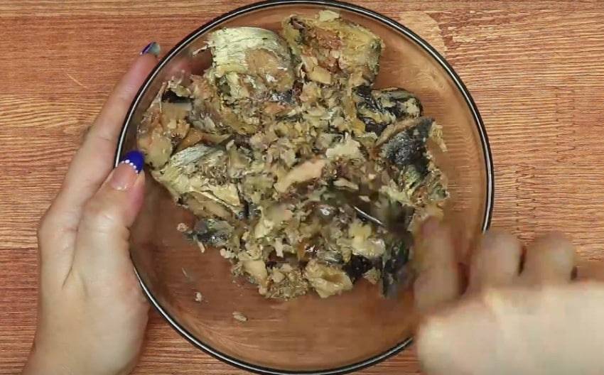 При использовании консервы, необходимо дать стечь жидкости и отделить косточки от рыбного мяса.