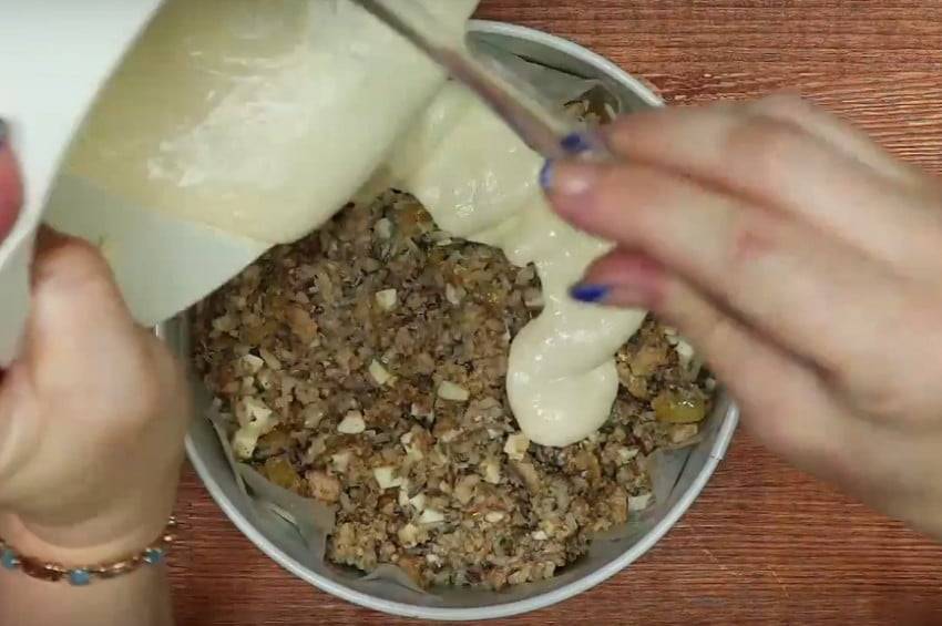 5. Форму смажьте маслом и соберите пирог. Первым слоем идет 1/2 часть теста, далее начинка, сверху оставшееся тесто.