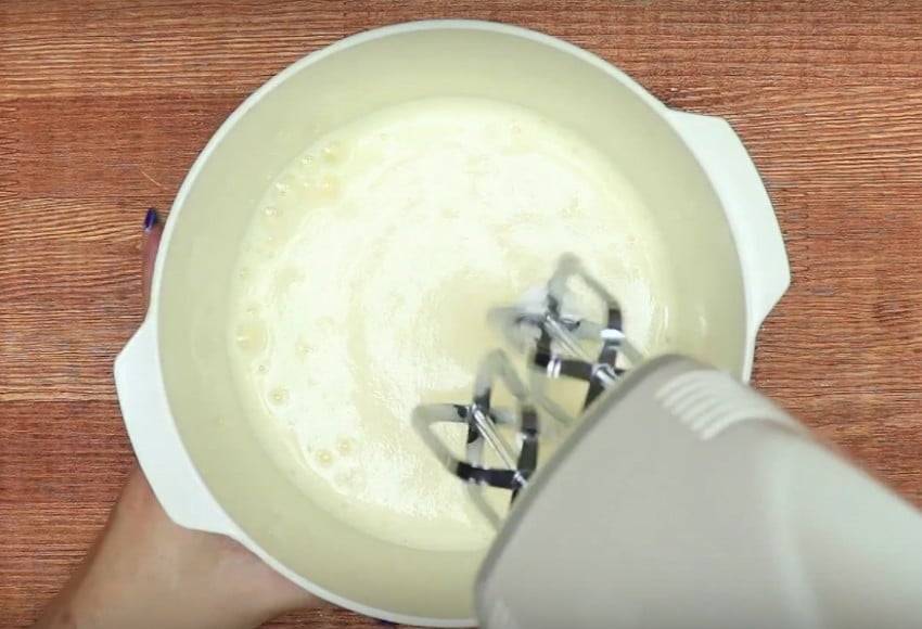 3. Яйца (3 штуки) вылейте в емкость, взбейте венчиком, добавьте сметану, майонез и разрыхлитель. Перемешайте до однородности.