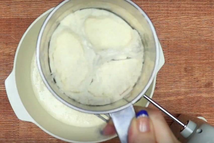 Всыпаем в тесто полтора стакана муки. Далее, смотрим по консистенции, если тесто густое — добавляем еще сметаны, если жидкое — подсыпаем муки.