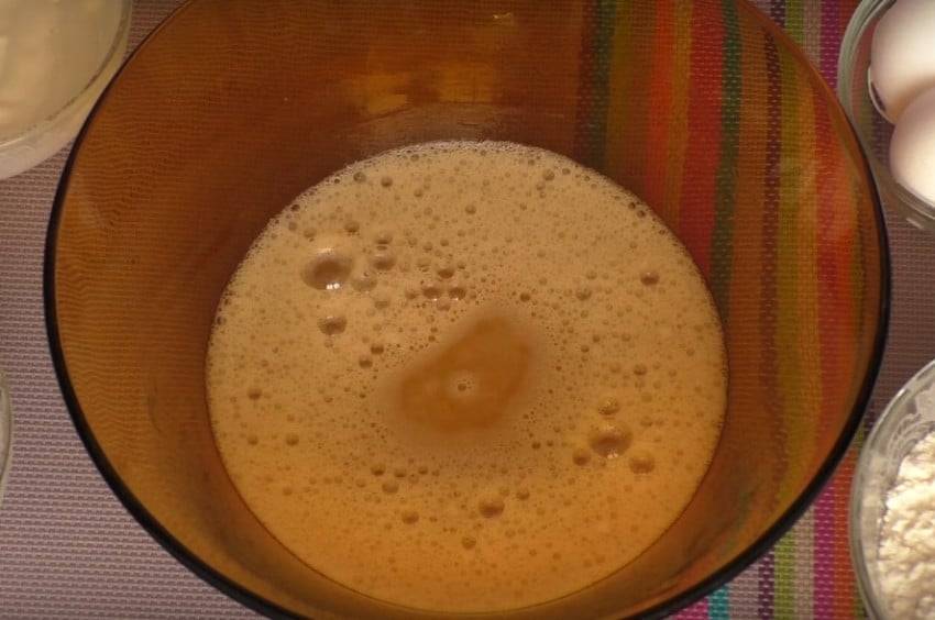 3. Муку просейте, добавьте ее в жидкую массу и хорошо размешайте. По консистенции будет похоже на густую сметану.
