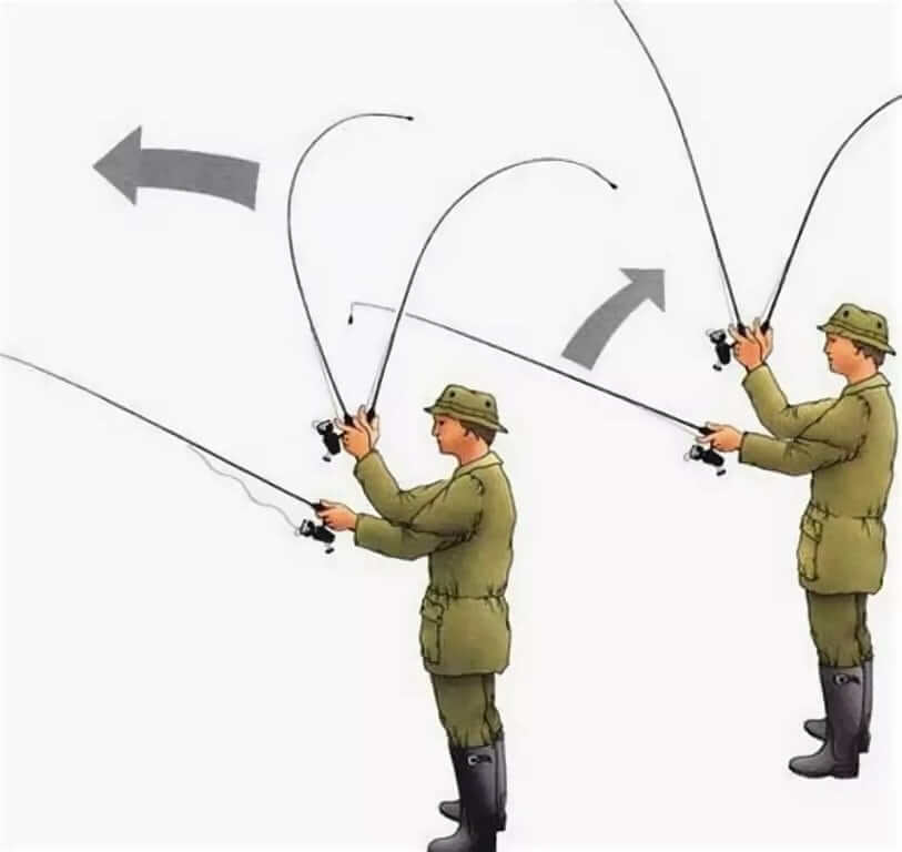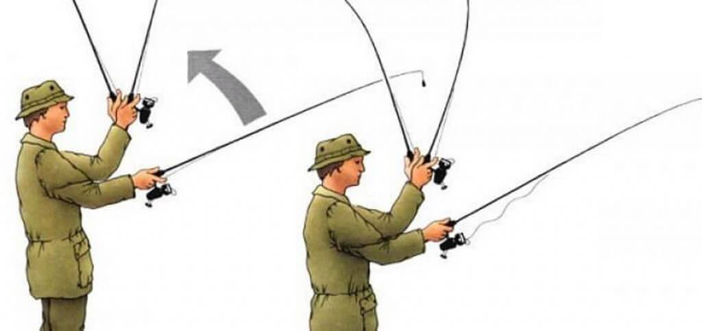 - Техника заброса двумя руками — при правильном исполнении может быть самой мощной и точной. Нужно взять одной рукой начало ручки, а другой область возле катушки и замахнуться с большим градусом отклонения за спину. После этого нужно всем корпусом выпрямиться и плавно повести удочку за собой, чтобы она выпрямилась, и приманка набрала скорости для дальнего полета. Когда вершинка находится над головой, нужно отпустить шпулю и дать возможность приманке потянуть леску за собой далеко.