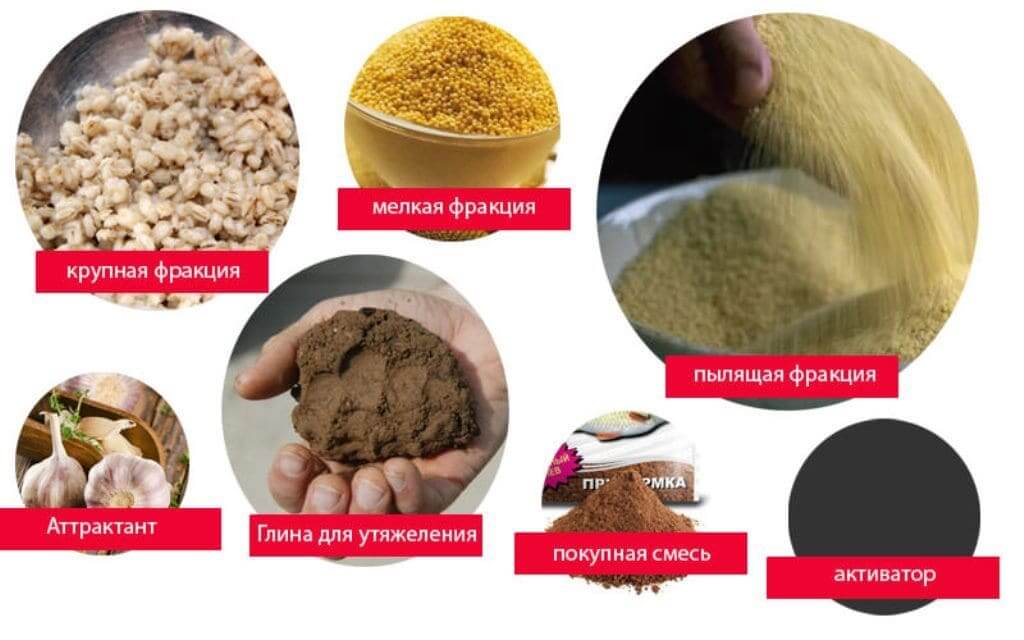 Элементы прикормки, которые используются и в качестве приманки на крючок, добавляются после полного увлажнения смеси, особенно строго это относится к животной наживке. Ароматизаторы вводят путем растворения в воде, используемой для приготовления смеси.