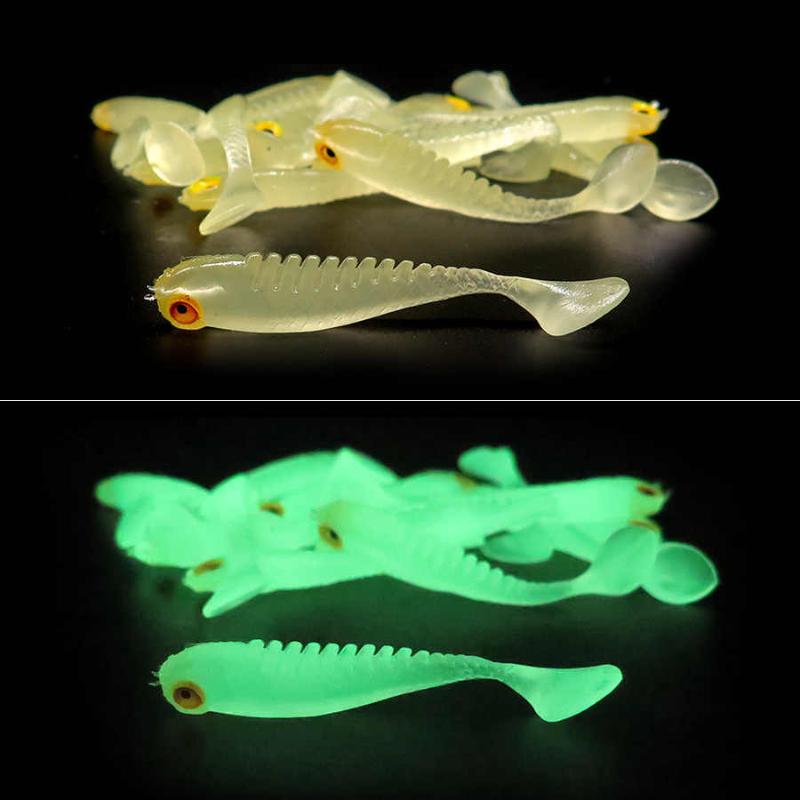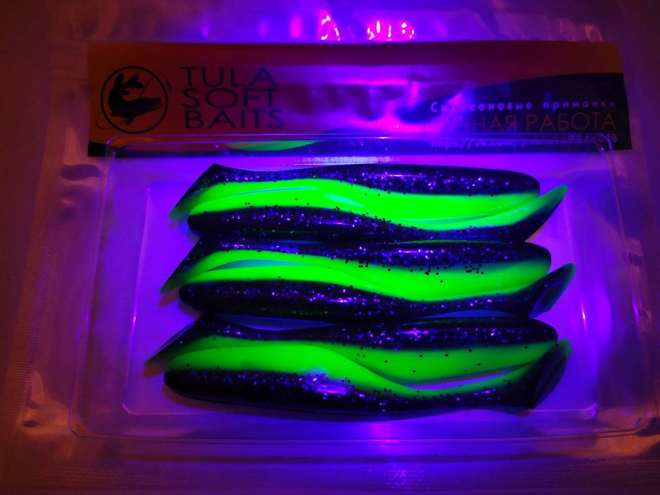 Люминесцентные приманки могут хорошо работать на очень больших глубинах. Например, при целенаправленной ловле джигом сомов на очень глубоких ямах, куда почти не проникает солнечный свет. Сом, хотя и совсем не различает цвета, хорошо реагирует на светонакопительные приманки, поэтому использование такой резины может быть вполне оправдано.