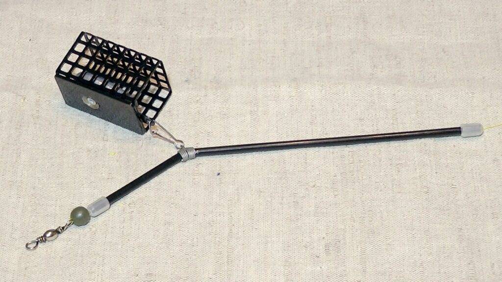 В общем виде оно представляет собой изогнутую пластиковую трубку, в месте изгиба которой надет вертлюжок с карабином. К нему крепится кормушка и тем самым изолируется от основной лески и удаляется от поводка. Основные требования к приспособлению таковы: