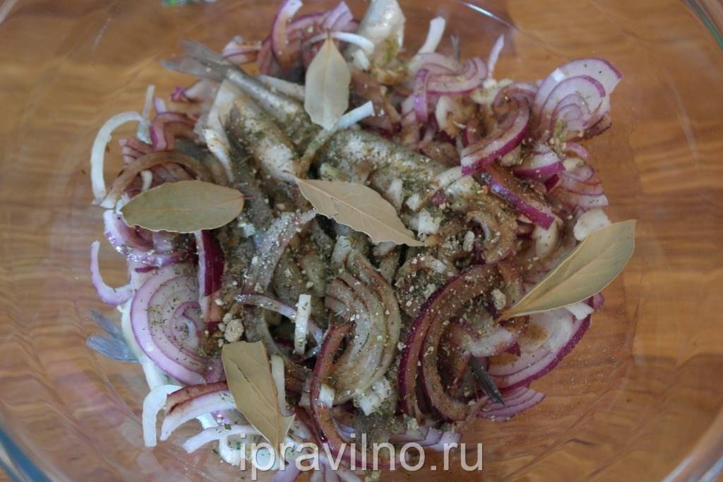 - Корюшку отправляем в глубокую миску, к ней добавляем лук, соль и специи, руками перемешиваем эти продукты, стараясь распределить приправы по всем рыбкам равномерно.
