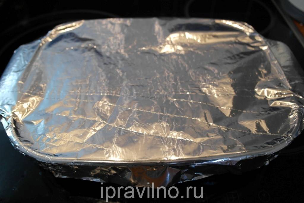- Противень устилаем фольгой, оставив часть для того, чтобы накрыть блюдо.