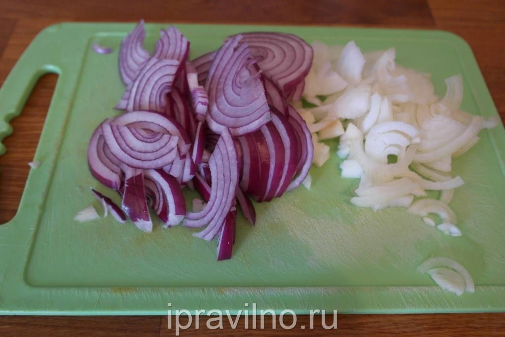 - Пока морепродукты стекают, луковицы порежьте полукольцами. Лучше всего для этого рецепта взять салатный синий или белый лук.