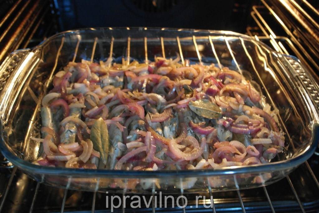 - Спустя 10 мин., на дно формы необходимо выложить рыбу, равномерно распределив ее по противню, контролируя, чтобы тушки не соприкасались между собой.