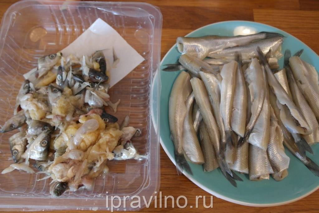 - После этого нужно срезать с корюшки головы, а затем убедиться, чтобы внутри рыбы не осталось костей и органов.