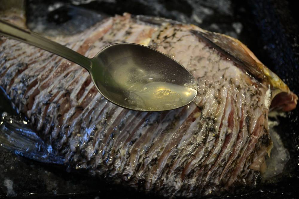 В разделанной рыбе (оставила с плавниками) по спинке, в которой самые «назойливые» косточки, сделала глубокие, до позвоночника, частые надрезы. Буквально через 3-5 мм, не реже! Фактически нашинковала тонкие кости спины.