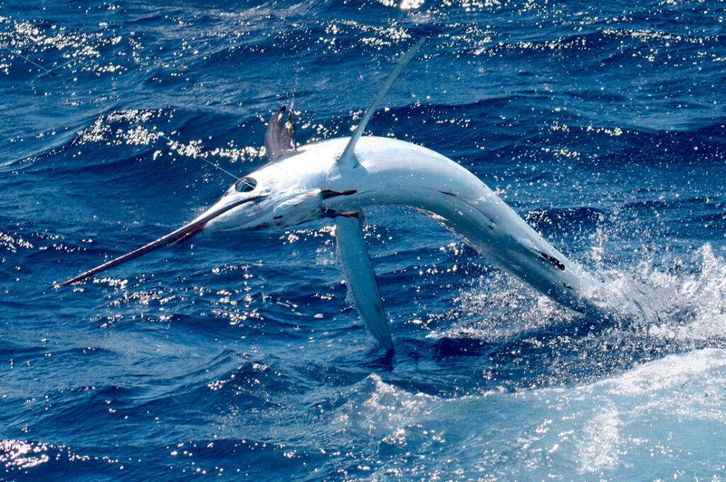 Рыба-меч, в отличие от марлина, имеет гладкое туловище и удлиненную верхнюю челюсть.