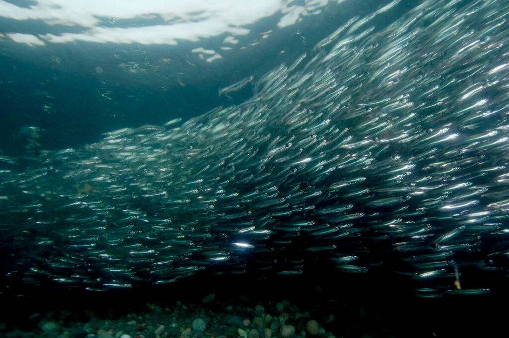 Стая мойвы в море