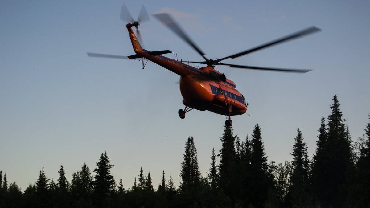 Где-то в процессе очередной (или тот же?) вертолет с нахлыстовиками улетает:
