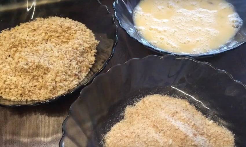 5. Приготовьте 3 плоские емкости – одну с яичным кляром, вторую – с сухарями, третью – с орехами.
