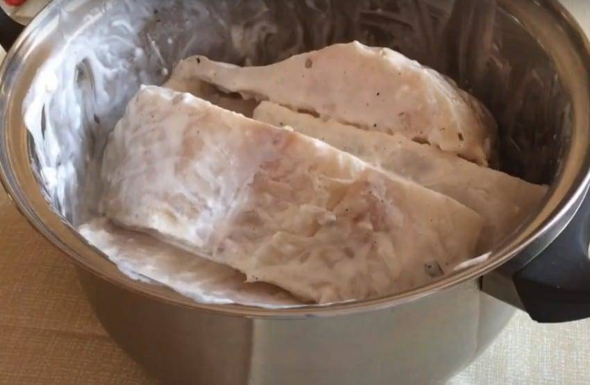 2. В небольшой емкости соедините сметану, майонез, мелко нарубленный чеснок, соль и перец. Выложите соус в емкость с рыбой и промажьте каждый кусочек.