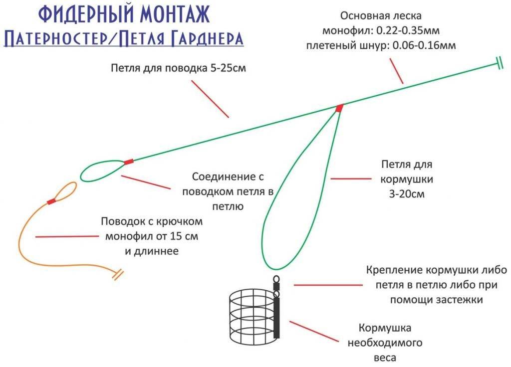 Функция оснастки донного удилища основана в прямой передаче поклевки от поводка на кончик снасти без помех кормушки. Для осуществления этого действия рыболовами разработан ряд специфических вязок, обеспечивающих нужные условия лова. Ловля фидером в стоячей воде ведётся с применением таких монтажей, как симметричная петля и патерностер. Для ведения фидерной рыбалки на течении применяют асимметричную петлю, монтажи с трубками-противозакручивателями, а также методику вязки скользящей кормушки или же инлайн. Каждый тип монтажа имеет свой определённый алгоритм формирования, что требует от рыболова знаний и практического навыка умения вязки различных видов узлов, применяемых в рыболовном оснащении.