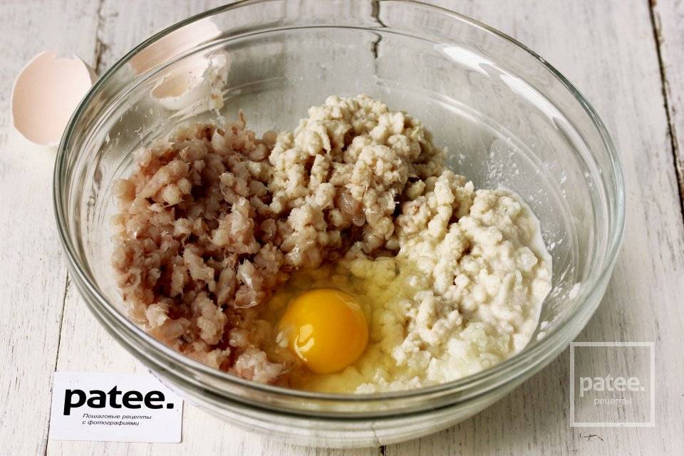 1. Промываем филе, нарезаем и перекручиваем на мясорубке, меленько шинкуем луковицу и добавляем в фарш.