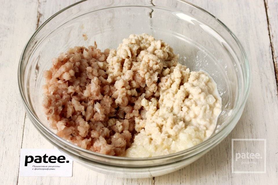 3. Отжимаем мякиш, разминаем и смешиваем его с яичной массой. Накрыв миску, отставляем на 20 минут в сторону.