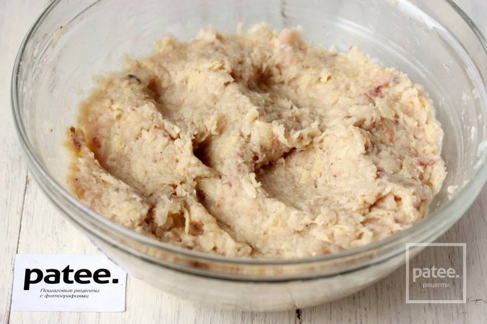 - Добавить мякоть в фарш, перемешать. Смесь получится более густой.