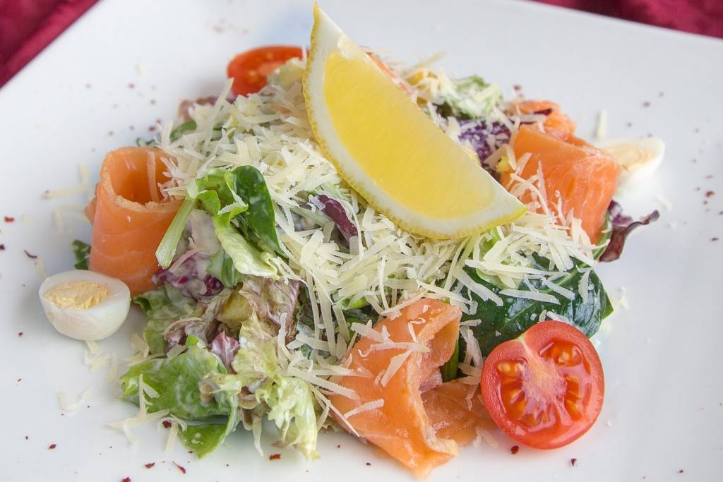 Благодаря рыбе, салат вполне можно считать диетическим, поскольку пищевая ценность салата Цезарь с семгой составляет всего 150 калорий.