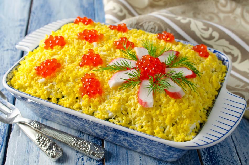 Нежное украшение праздничного салата «Мимоза» на свадьбу