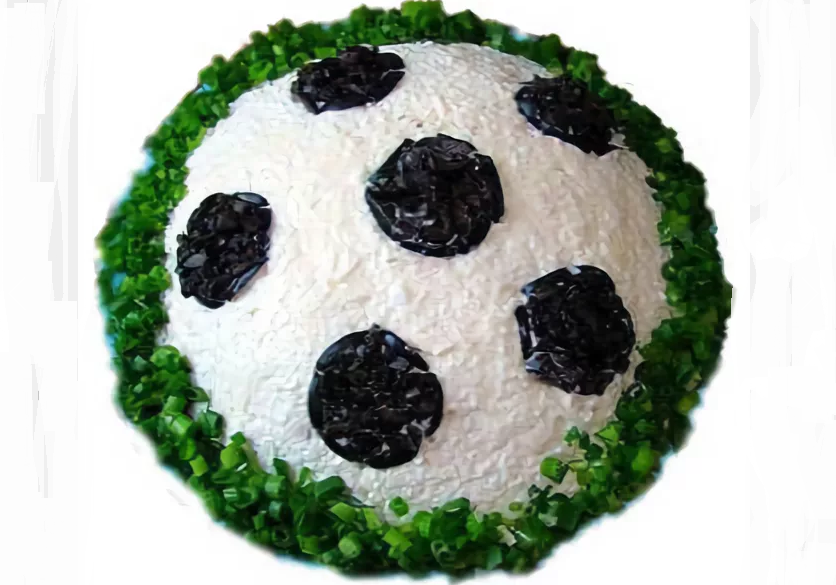 На 23 Февраля можно украсить салат в виде футбольного мяча. Но тогда верхний слой будут не желтки, а белки.