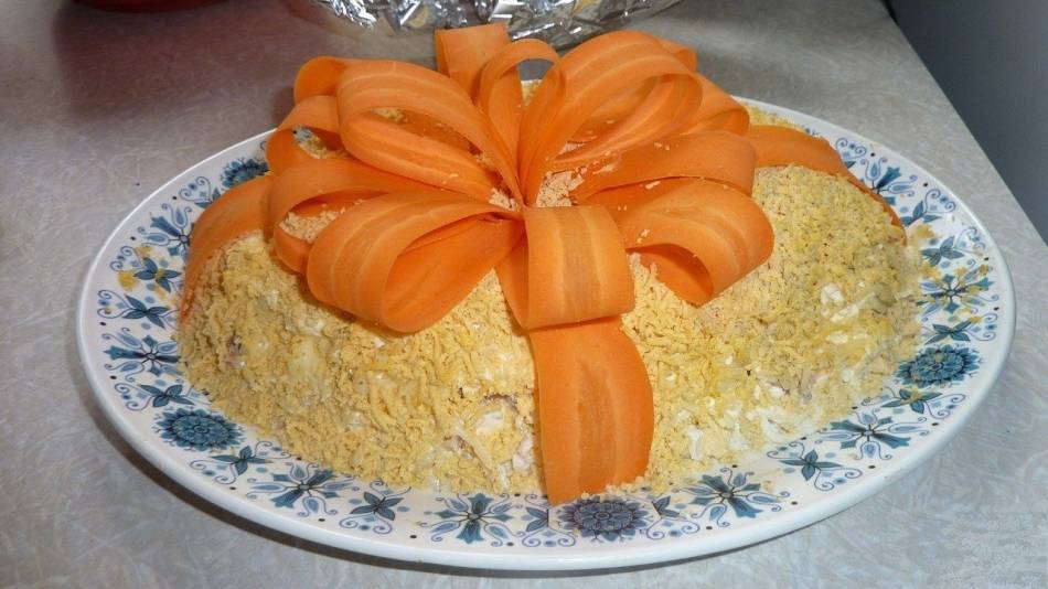 На юбилей. Если вы сможете сделать такие тонкие «ленты» из моркови, то украсьте салат именно так — необычно и красиво.