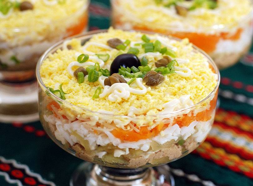 Простой в приготовлении салат, довольно распространенный и традиционный вариант. О нем знают почти все. Он готовится абсолютно без картошки и без риса, но имеет другой состав, который делает его неповторимым.