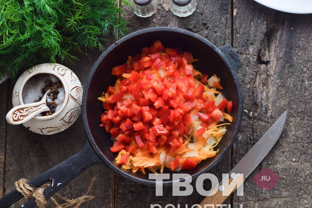 - На оставшемся подсолнечном масле обжарить морковь, лук и болгарский перец. Переложить овощи в кастрюлю к томатам и рыбе, хорошо перемешать и тушить еще 15 минут.