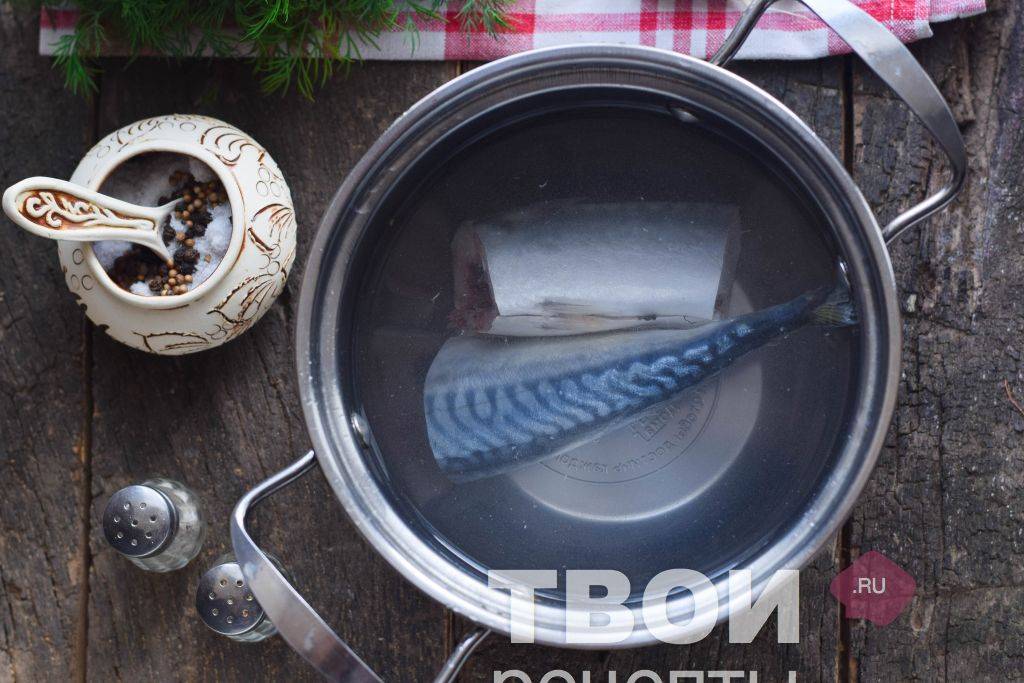 - Подготовленную скумбрию поместить в кипящую воду, подсолить, добавить специи и отварить около 15 минут до готовности.